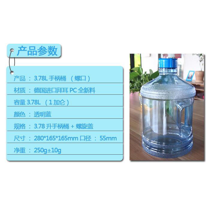 型号:1加仑PC饮用水桶带手柄,配螺纹盖子。1箱30个。850ML水杯一箱50个。